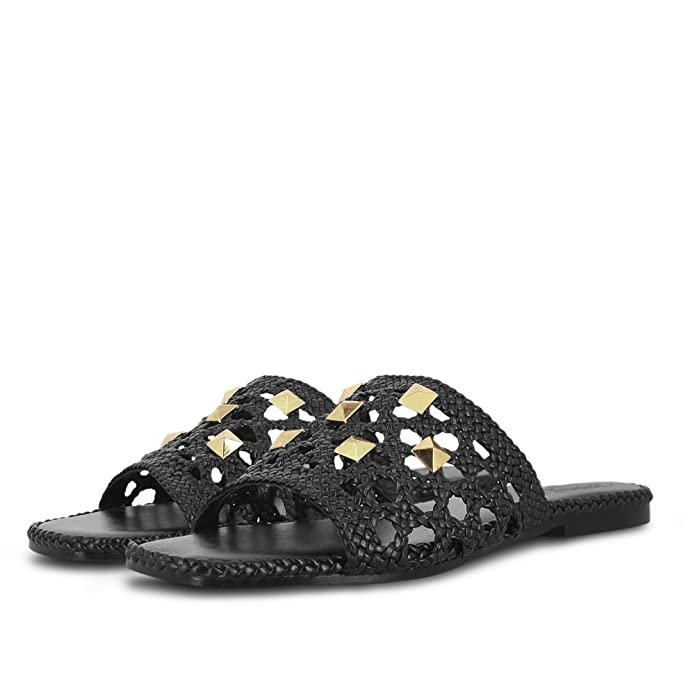 SaintG Women Black Hand Women Leather, Studs Embellished Slip On Slide Flat/sandals