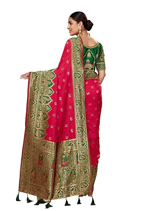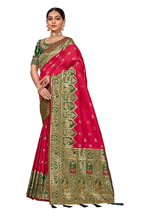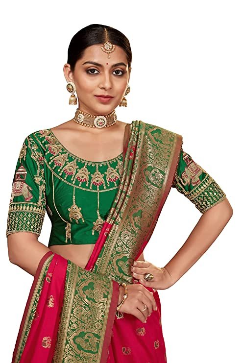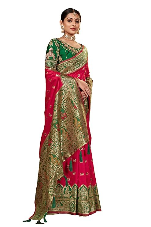 About this Item Saree Fabric: Banarasi Silk , Blouse Fabric : Art Silk Saree Color: Pink , Blouse Color: Green Saree Length: 5.5 Meter , Blouse Length: 0.8 Meter Saree comes with unstitched blouse piece,which is attached with end of the saree only. Buyer have to cut blouse part from the saree. Stiching service will not be available. There might be color variation due to screen resolution and digital photography Additional Information Item Weight900 g Item Dimensions LxWxH13 x 10 x 2 Centimeters Included ComponentsWith Blouse Piece