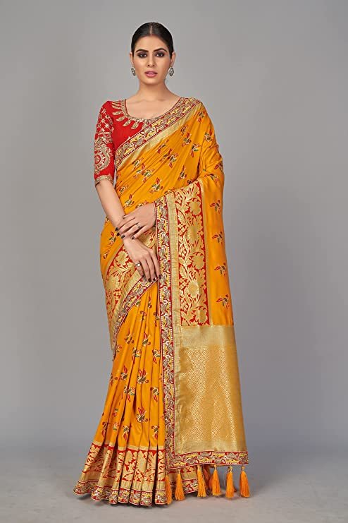 About this Item Saree Fabric: Silk blend Blouse Fabric : Silk Saree Length 5.5 Mtr + 0.80 Cm Blouse Saree Color :- Yellow, Blouse Color :- Red Saree work :- Zari Woven, Blouse work :- Embroidery Work Wash care :- Dry Clean Only Additional Information Item Weight1 kg 370 g Item Dimensions LxWxH35 x 30 x 2 Centimeters Net Quantity1.00 unit Included ComponentsWith Blouse Piece